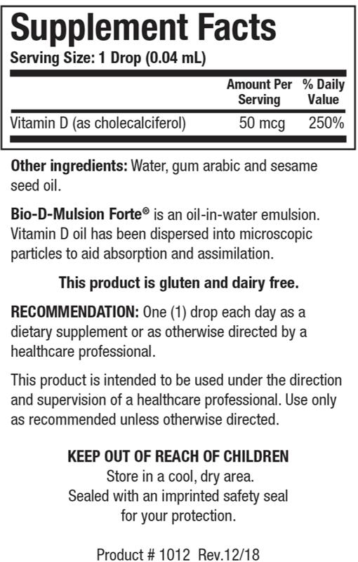 Bio-D-Mulsion Forte™ is an oil-in-water emulsion liquid. Vitamin D oil has been dispersed into microscopic particles to aid absorption and assimilation. There are 750 drops per small bottle (1 fl oz) which offers tremendous value for money for a highly absorbed form of this vital nutrient.