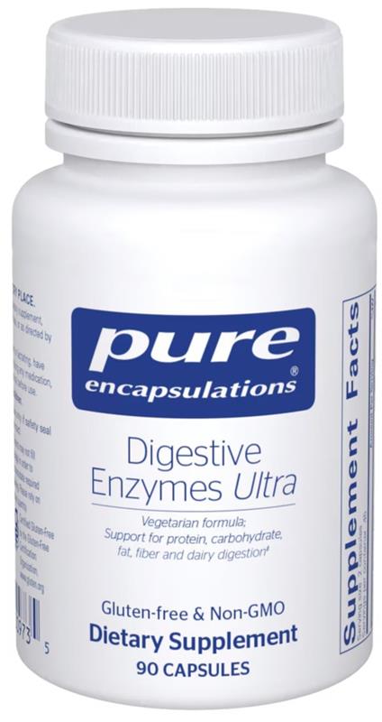 Digestive Enzymes Ultra contains a high-strength, broad-spectrum mixture of vegetarian digestive enzymes. This comprehensive formula provides enzymes that are involved in the digestion of protein, carbohydrate, fat, fiber and lactose.