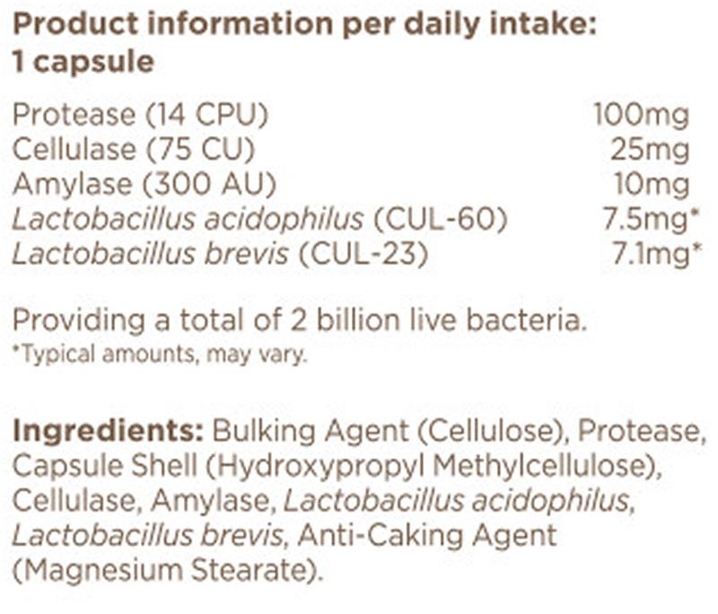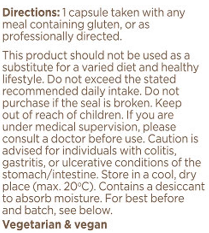 One capsule taken with any meal containing gluten, or as professionally directed.