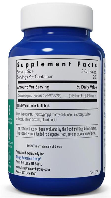 Essential Biotic Saccharomyces Boulardii - A probiotic, non-colonizing yeast species closely related to Brewer's yeast and not related to the yeast group to which Candida belongs. Saccharomyces boulardii taken orally produces lactic acid and some B vitamins as it becomes established. During use, friendly probiotic bacteria are allowed to colonize in the GI tract making Saccharomyces boulardii particularly beneficial in balancing intestinal microbiology. It is then eliminated after supplementation is stopped. It also has been shown to support production of secretory IgA.