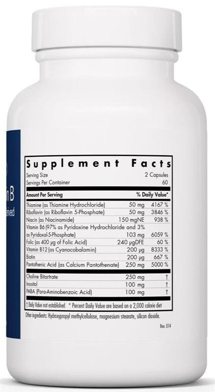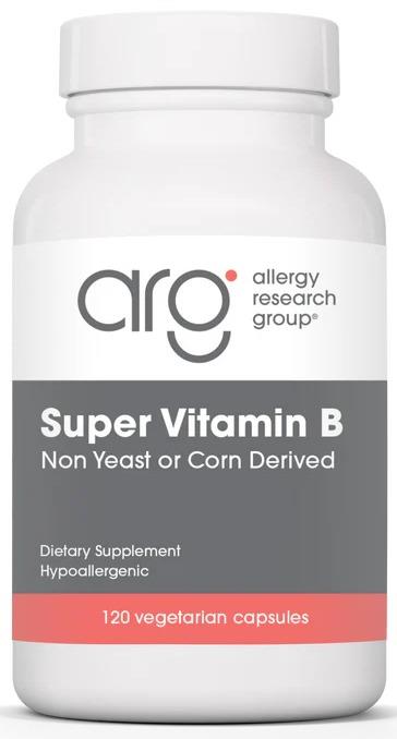 Super Vitamin B Complex is an advanced and complete B-vitamin supplement. It provides substantial amounts of all eleven B-vitamins, including the co-enzyme forms of vitamins B2 and B6 for enhanced bioavailability, and extra pantothenic acid for adrenal support. Instead of using vitamins derived from allergen-containing plant sources such as yeast or corn, the B vitamins in this formula are synthesised from hydrocarbons, which originate ultimately from living sources, with very low allergy potential.
